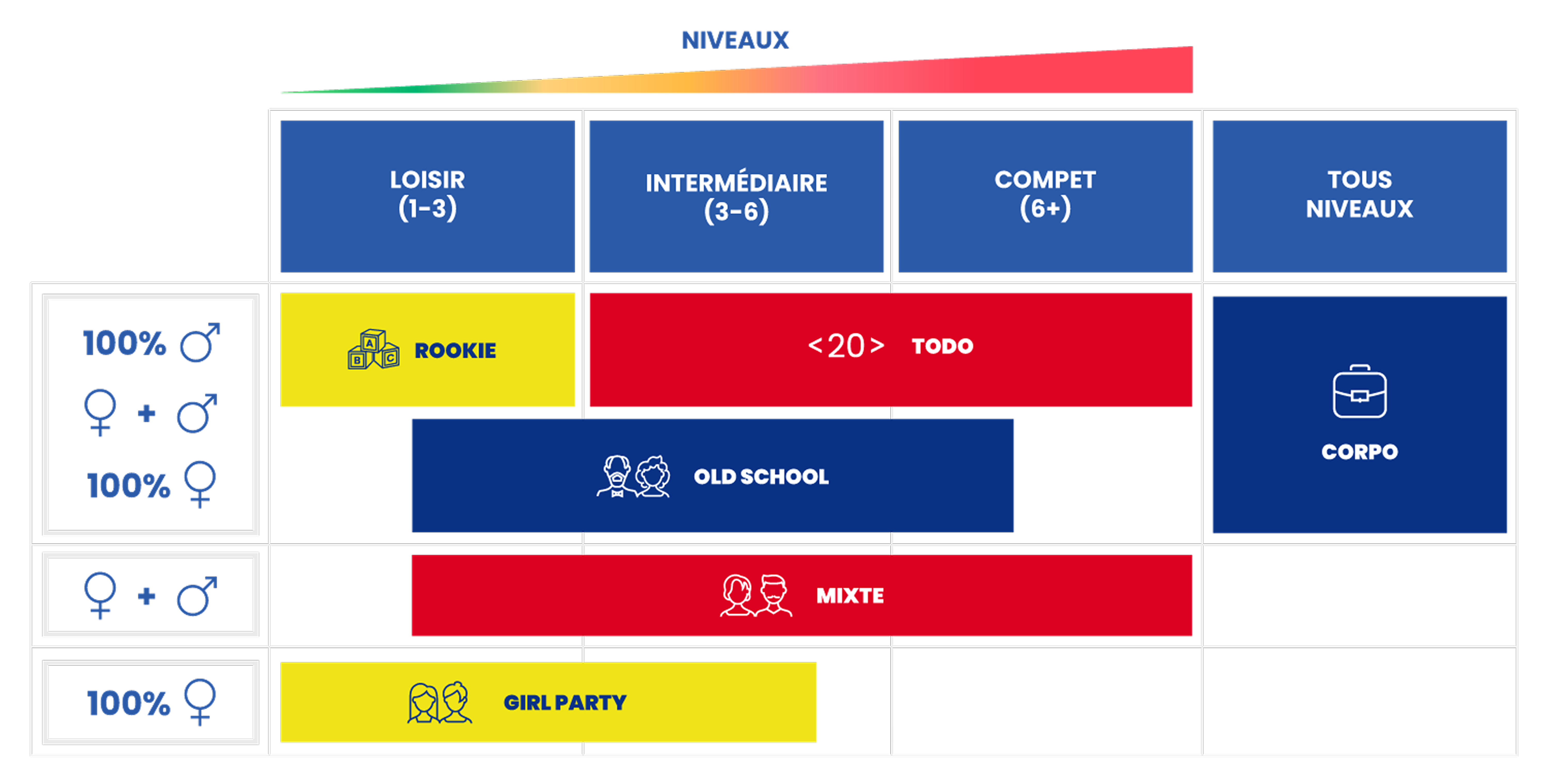 Pour ceux qui ont toujours voulu essayer le padel, mais n’ont jamais trouvé quelqu’un pour se lancer. Ici on apprend, on rigole, et on joue en duo ! Niveau 1/2/3